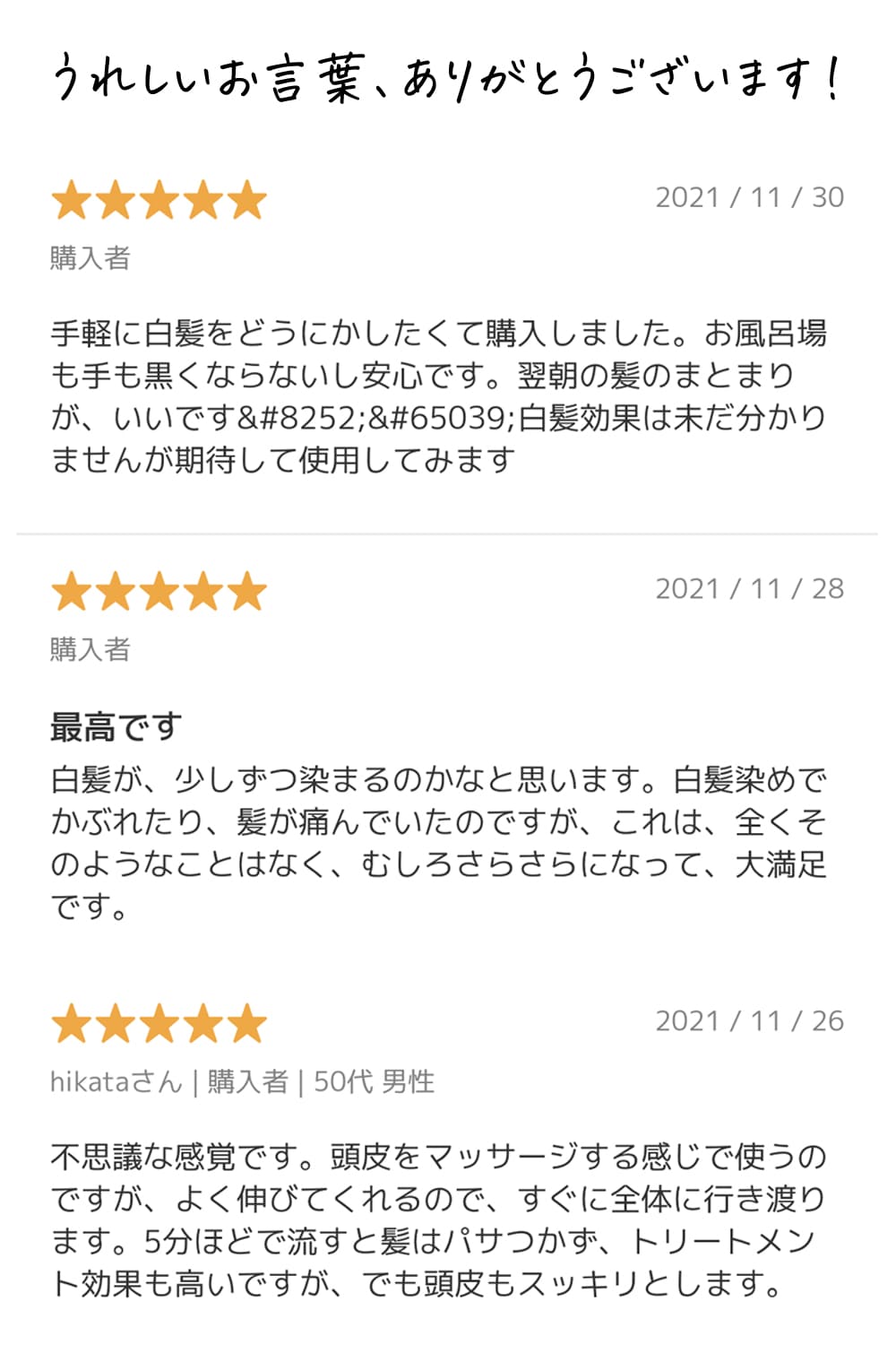 黒髪が蘇る!?と宣伝がありますが、個人差はありますがご覧の通り、しっかりと効果があったという人もたくさんいますので、「黒髪が蘇る」は本当のようですね。